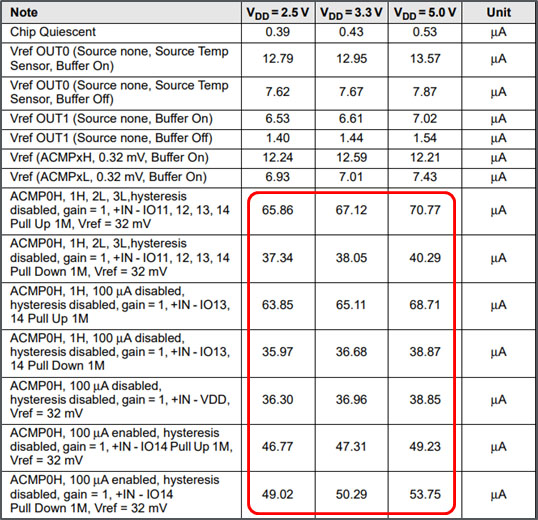 格林帕克CMICs are often used in projects to reduce the system’s current consumption. However, several components within GreenPAKs, when active, can cause a noticeable change in current consumption. Amongst the most consumptive macrocells are the analog comparators. Table 1 is taken from the SLG46826 datasheet to highlight the ACMP’s consumption.