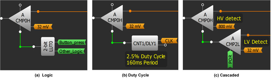 唤醒睡眠控制需要配置为WS模式的专用计数器。这是在许多(但不是全部)Greenpaks中提供的。PWR UP.控制可用于任何GreenPak,带有ACMP。当信号是HI时,ACMP为ON;使用逻辑,计数器或其他宏单元关闭ACMP可以大大降低功耗。例如,如果需要两个不同的电压阈值,则可以保持更高阈值的ACMP,直到满足较低阈值。