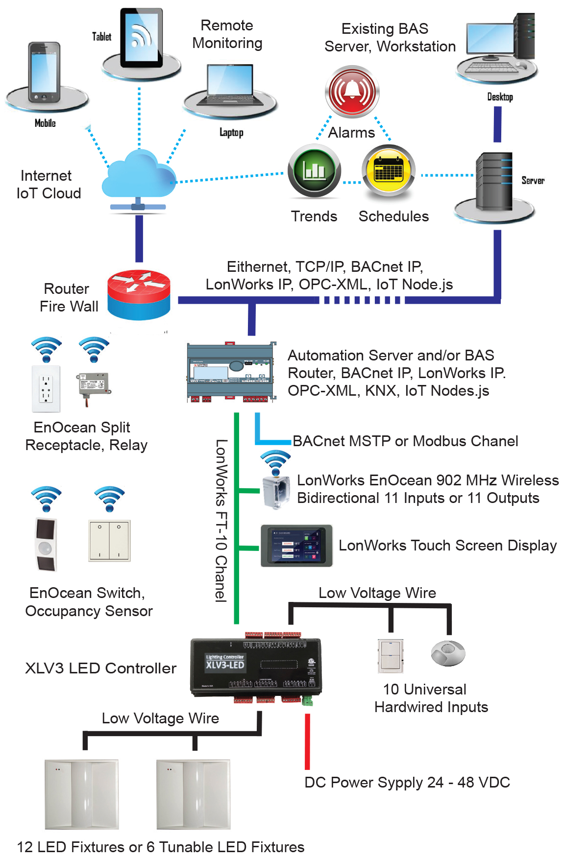 来自一个叫做的公司雷电竞下载appBlueCean IoT..他们制定了一个很好的解决方案 -XLV3 IOT LED控制器/驱动程序,这两个都是电源并控制LED灯。仅在一个模块中,产品包含12个独立控制的75瓦恒流调光驱动器。每个通道不是由单独的0-10V调光信号控制,而是仅在FT-10或BACnet信道上唯一寻址的值(网络变量)。系统架构如下所示。
