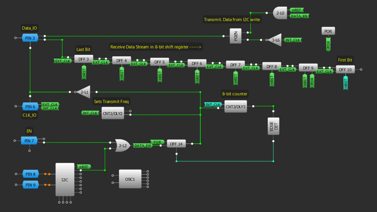 - Configure DFF to enable transmission. Connect output to transmit clock signal andOEof I/O pins.