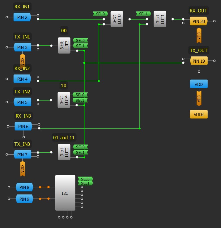 - 配置3:1多路复用器的LUT与从外部UART端口到MCU接收的RX信号。