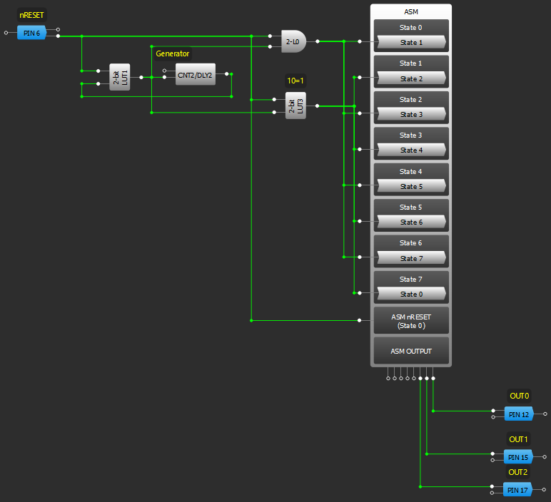 当PIN6变高时,ASM从复位状态(状态0)到下一个状态(状态1)。通过这些状态的以下转换为CNT2切换了第一个高,那么低,等等。
