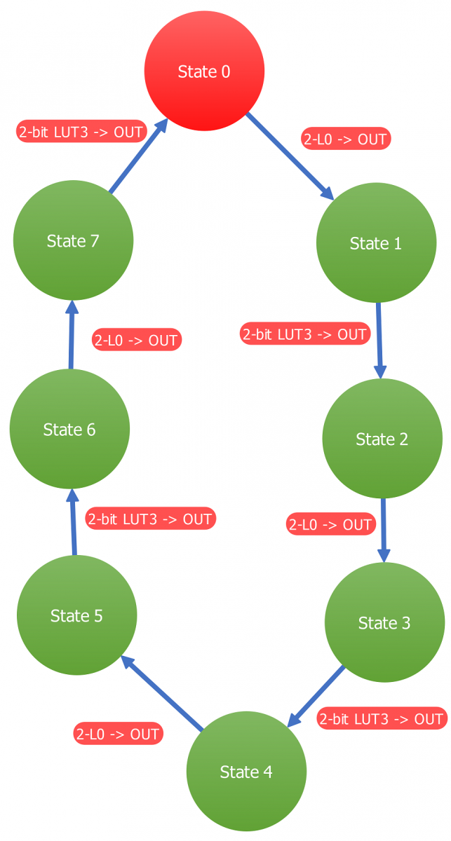 考虑上面的3位计数器示例中的SSM。CNT2和2位LUT1用于生成时钟。ASM使用串联连接的8个状态。2位LUT0和2位LUT3用于防止两个接近状态转换上的逻辑高信号。每个状态的ASM输出的值如下所示。