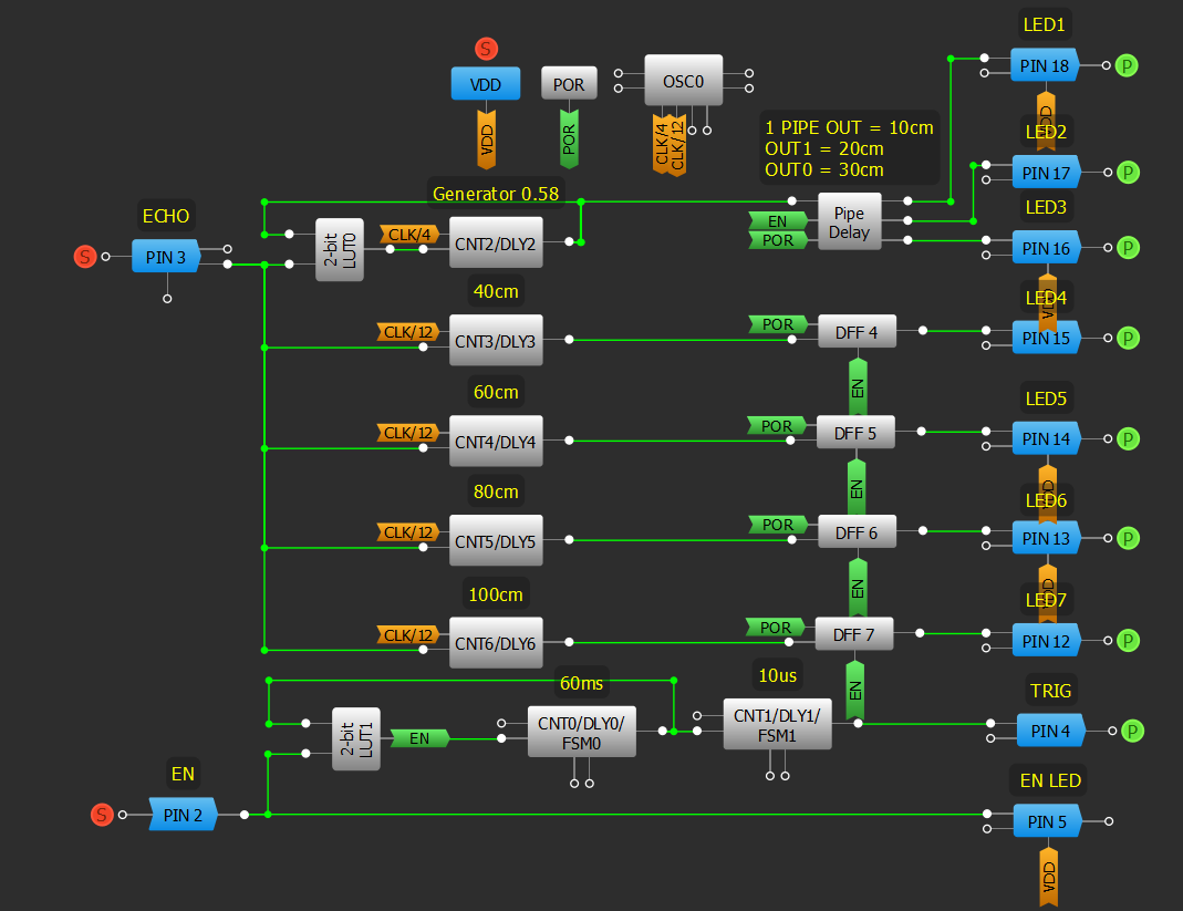 - Configure CNT/DLY blocks to上升边延迟mode to measure varied distances.