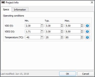 When starting a new GreenPAK Designer design using a dual rail part you’ll be asked to input the voltage range of both rails (Figure 21). The available ranges of both rails will vary from part-to-part. The higher voltage rail should be designated as VDD, not VDD2.