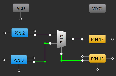 In dual rail parts the GPIO connections to the first and second rails are indicated by the color of the IO PIN within GreenPAK Designer (Figure 22). VDD will be indicated by blue pins and VDD2 will be indicated by amber pins. Once inside the GreenPAK matrix the signals from the different voltage levels will behave identically.