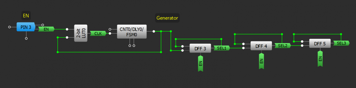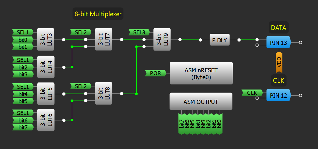 GreenPAKs are often used to transfer a data pattern. If the data is transferred from the GreenPAK or the data is transmitted along several lines from the SoC, they must be amalgamated for transmission on one line. Below is an example of the GreenPAK multiplexing a bitstream originating from the ASM output RAM.