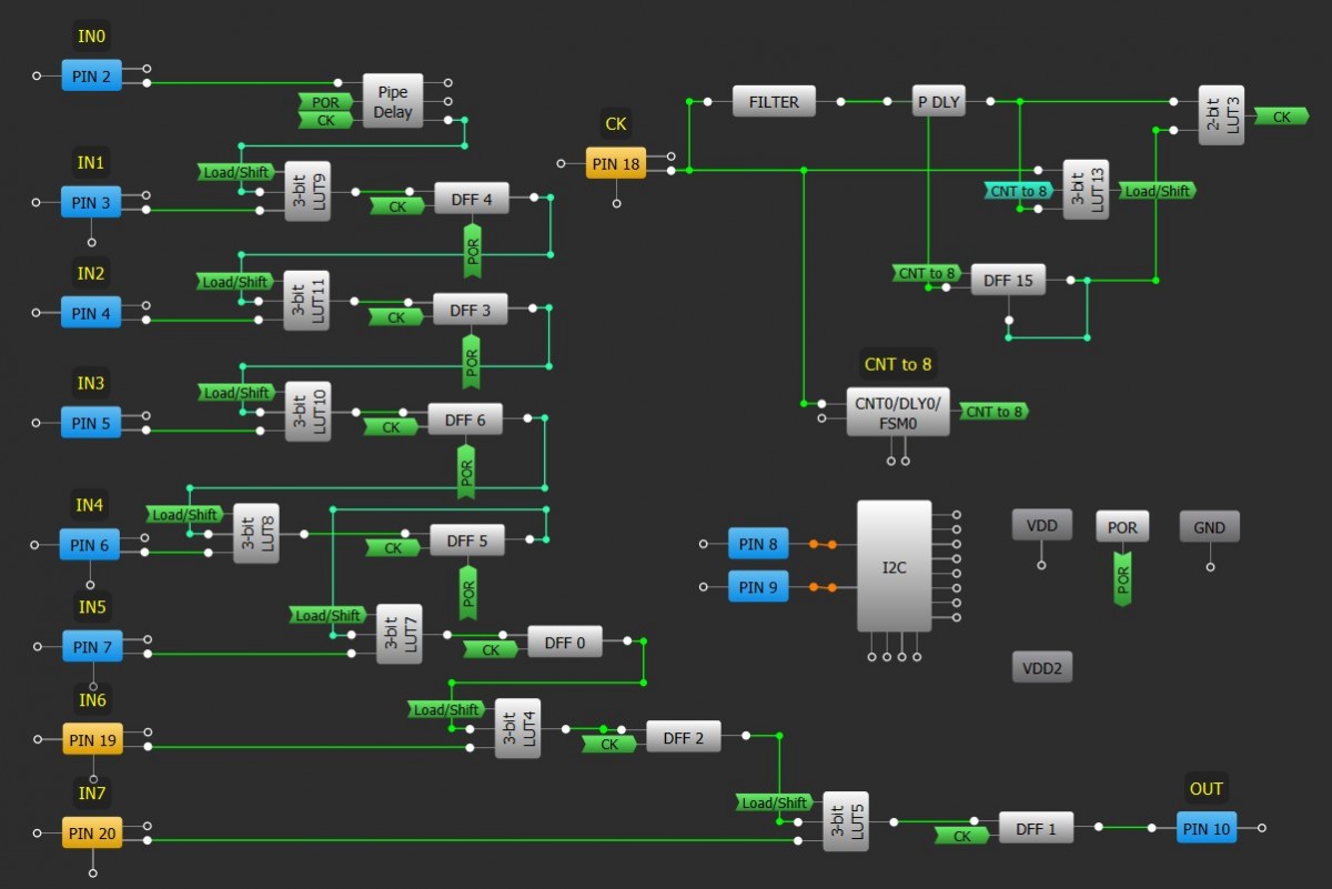平行于串行转换器通常用于使用一个或两根线(数据和时钟)从一个IC向另一个的数据发送数据。这里可以使用内部或外部时钟,并行位数受到GPAK I / O的数量和可用的内部块的限制。