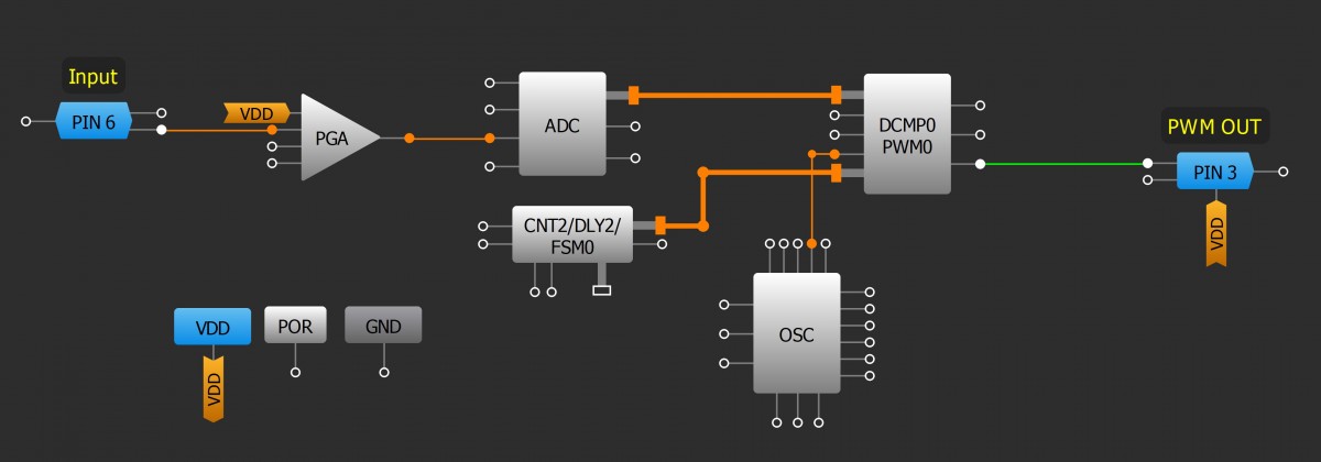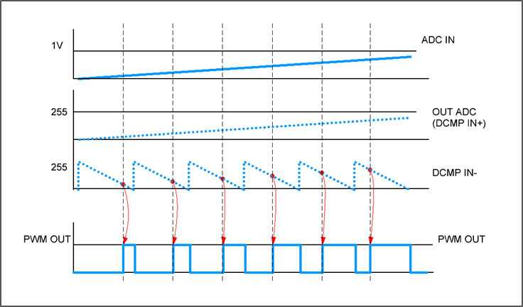 PWM发生器可用于控制设备,如直流电动机和LED。此实现使用连接到ADC与CNT2在PWM0值进行比较的模拟信号。如果CNT2值小于数字化模拟信号PWM0的输出为高。后CNT2值为0 PWM0的输出为低。