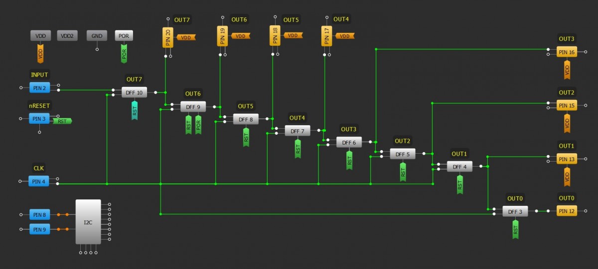 - Add an Input connection for the reset function and connect it to thenRESETof the shift registers.