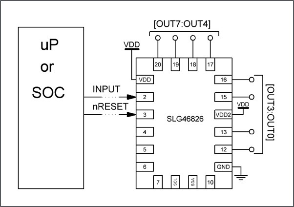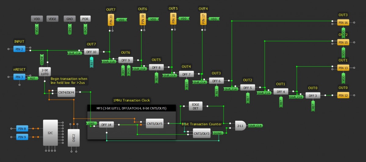Deserialization ICs are used so that data can be sent across one wire and interpreted as multiple bits of data. When adding an external clock isn’t realistic, the GreenPAK can use an internal oscillator triggered from an action on the input line, such as a LOW signal that’s held for a pre-determined period.
