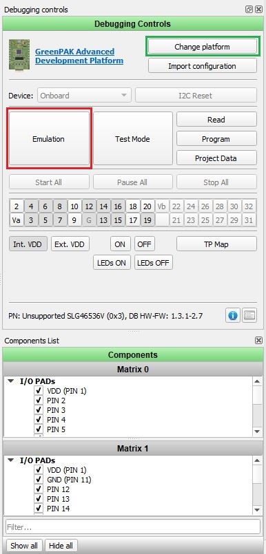 Emulation allows, with the presence of a demo board and the GreenPAK chip, to check the operation of your design directly in the hardware without permanently programming a part. This allows you to quickly make changes to the project and use your emulation to check your guesswork.