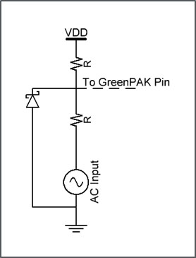 GreenPAKs具有0V的端子电压范围至5.5V的VDD值。为了解释的AC信号,在使用GreenPAK的0V点杂交的DC偏移移位应所述AC信号和GreenPAK销之间来实现。所述GreenPAK的VDD和AC信号,在图16所示的1之间的电阻分压器:这可以通过一个1来实现。