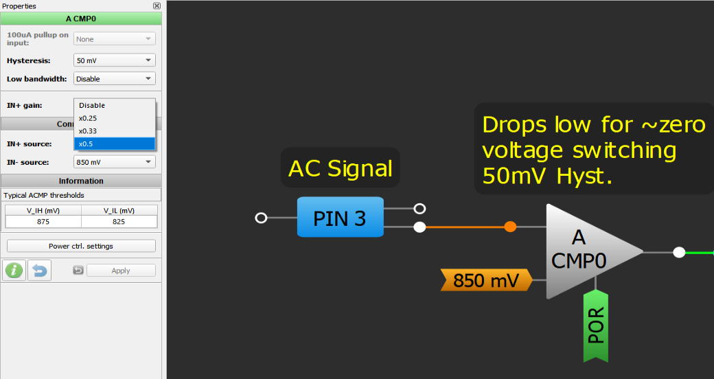 零电压交叉检测至少需要,一个或两个比较器和计数器。比较核对的基准电压,其可以来自GreenPAK的可用参考电压或外部参考点进入的AC信号。如果期望的ZVCD电压大于可用GreenPAK参考电压大于所述AC信号可以替代地通过利用可以减少IN +增益比较器的属性设置内选项和减少的AC值进行比较,以类似缩放参考(图17)。