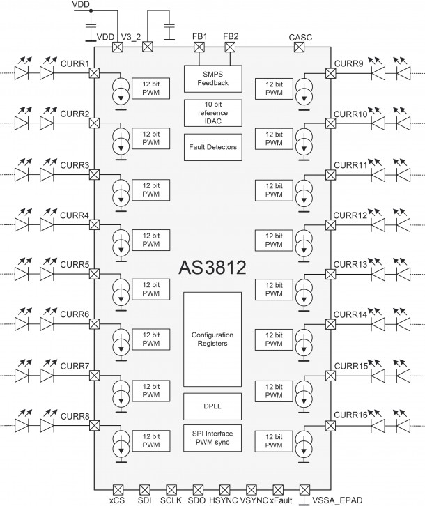 的AS3812 LED驱动器,用于LCD背光集成16个高度精确的电流吸收器与数字控制技术以提高4K和HDR LCD显示器的亮度控制。优于+/- 1%的高分辨率调光控制相结合的绝对电流精度允许横跨板的最高亮度均匀性。