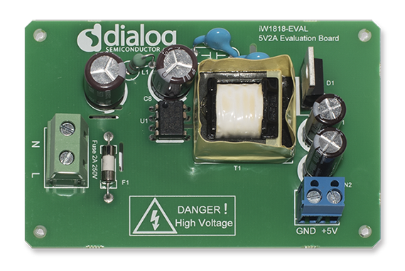 IW1818-eval评估板提供了用于开发10W单次输出电源的解决方案,用于白色商品,家电,工业控制设备和网络设备。它使用对话的IW1818 AccuSwitch™数字离线电源控制器IC,并使用初级侧控制的准谐振反激式转换器提供5V:2A调节输出。