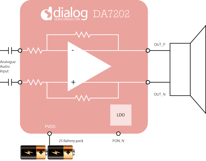 DA7202采用全差分开关模式放大器结构,具有固定+18 dB增益和差分模拟输入。它也有一个PWM调制器和H -架桥交换功率输出阶段,提供3.8 Wrms成8Ω负荷(10.2 w 4Ω负载),使便携式设备的扬声器声音响亮。