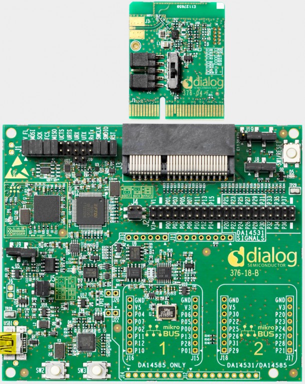 - 用于DA14530软件开发和功率测量的DA14530 Pro开发工具包包括主板、子板和电缆。