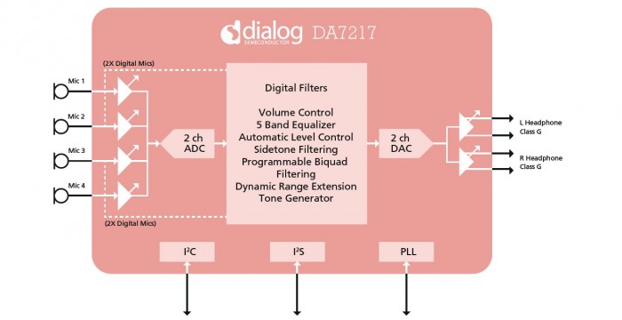 DA7217包含两个模拟麦克风输入路径,或多达四个数字麦克风输入路径,或两者的组合。在这个家族的另一个芯片,DA7218,有单端耳机输出,并已设计与耳机检测在附件中使用。