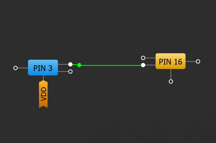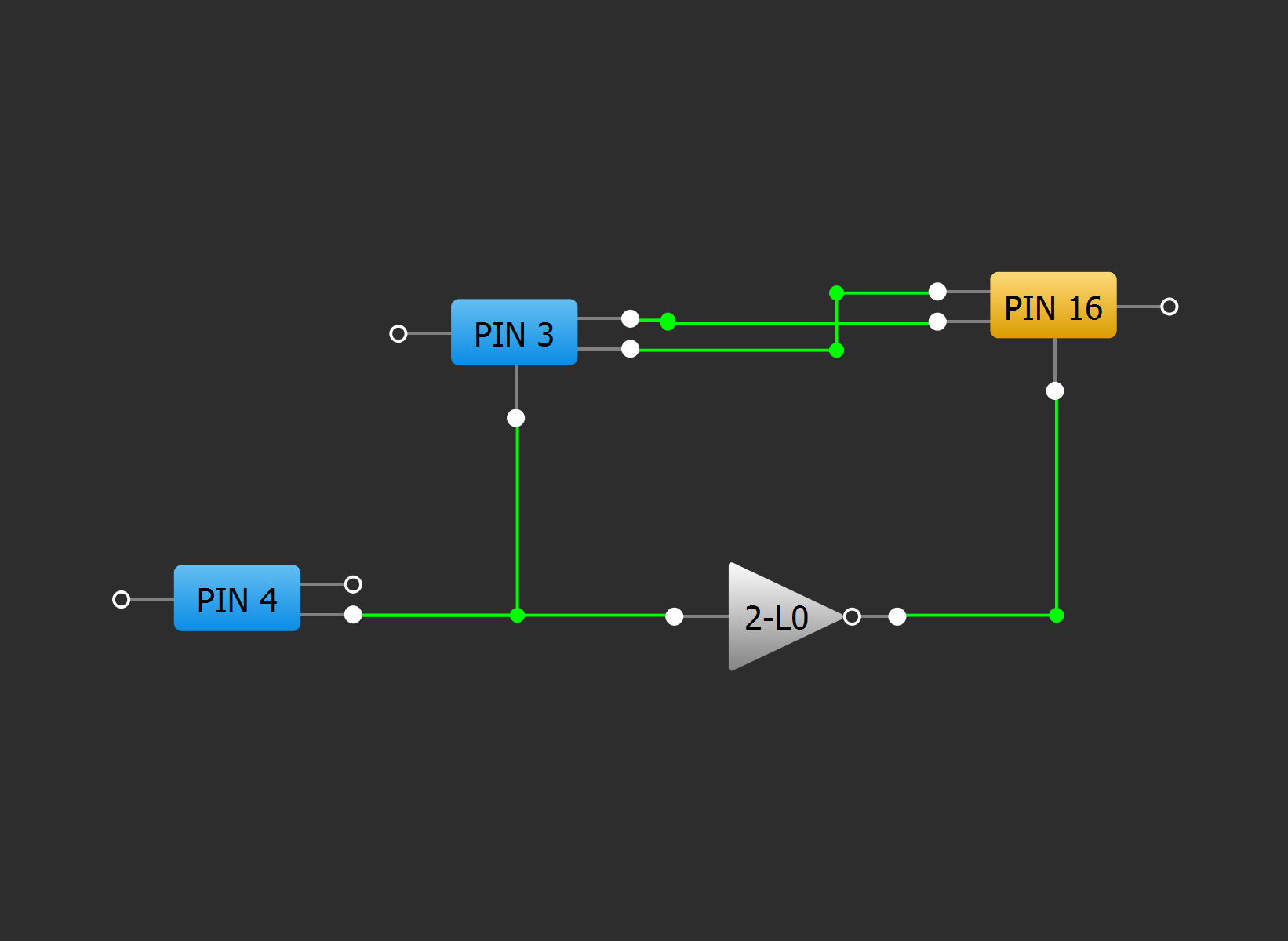 It is also possible to enable signals to selectively pass one direction or the other, under control of another signal. An example of this is shown in Fig 2 below, where a signal can either originate in Pin 3 or Pin 16, with the direct selected based on the state of Pin 4.
