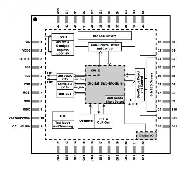 - SPI Daisy-Chain接口在支持16个以上的LED字符串时简化了设计