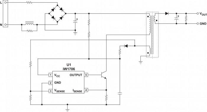 The iW1706 is a high performance AC/DC controller designed to drive an external power bipolar junction transistor (BJT) for peak current mode PWM flyback power supplies. Ideal for networking power supplies in applications such as ADSL modems and wireless access points, the iW1706 integrates a proprietary soft-start feature that allows for a smooth, yet fast start-up into capacitive loads between 330uF to 6000uF.