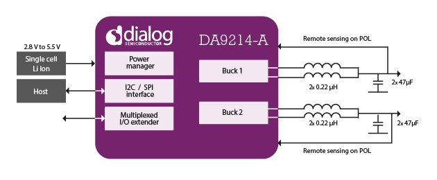 输入电压范围为2.8至5.5 V使其适用于标准5 V电源或USB电源。DA9214-A提供2x10输出电流,适用于最高执行的应用处理器,例如ARM Cortex A15 / A57系列的多核布置。由于多相拓扑DA9214-A,提供优异的负载瞬态响应和组件尺寸低于1毫米的高度。