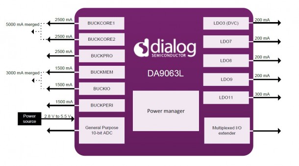 DA9063L是一个功能强大的系统PMIC,适用于单、双、四核应用处理器,如基于ARM Cortex-A9TM和Cortex-A15TM架构的应用处理器。