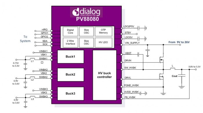 在某些应用中,多个PV雷竞技安卓下载88080可以一起使用,以提供足够的电源轨为更大的系统供电。在一个典型的应用中,有三个buck转换器可以用来为cpu、DDR存储器和其他辅助功能生成电源。这些buck变换器的通过器件是完全集成的,因此不需要外部fet或肖特基二极管。这样可以优化电源效率并减少外部组件数量。