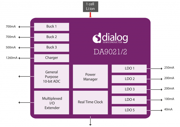 DA9022在一个DC-DC降压转换器上提供了更高的电压能力,非常适合外设和内存运行到3.6V。USB暂停模式的操作是支持的,为鲁棒性的USB电源输入是保护过电压条件。
