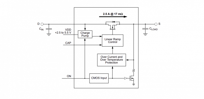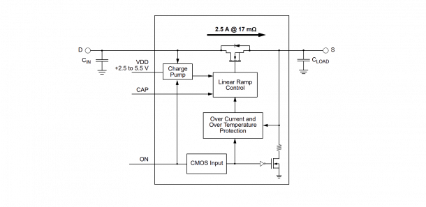 1.6mm²集成电源开关,带电荷泵,0.9 VD,斜坡控制,输出放电和保护