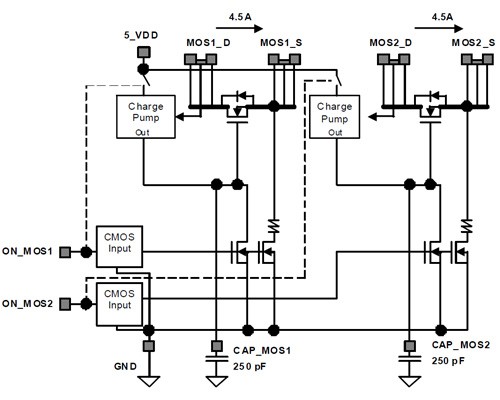 所述SLG59M1526V被设计用于负载切换应用。的部分带有两个4.5A额定的MOSFET接通由两个ON控制引脚。打开时间的MOSFET独立地由一个外部电容器调节。