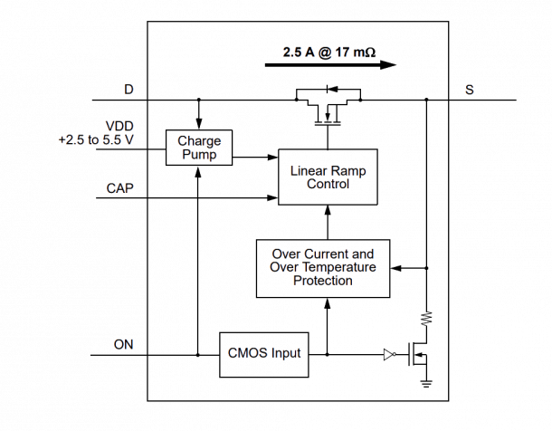 1.6mm²集成电源开关,带电荷泵,0.85 VD,斜坡控制,输出放电和保护