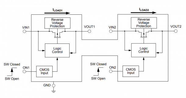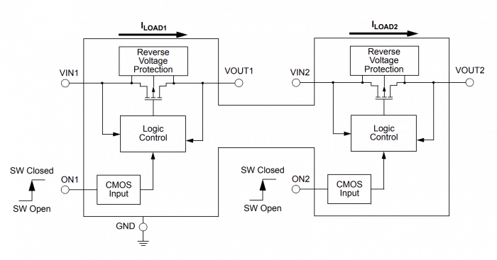 1.6平方毫米,双通道45毫欧/ 2电源开关与反相电流阻止和Active HIGH ON-OFF控制