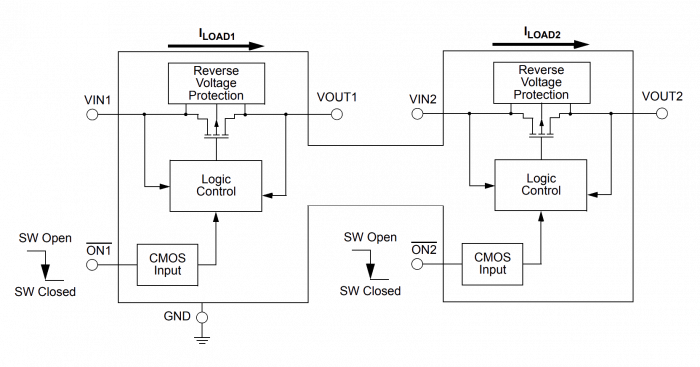 1.6mm²,双通道45mΩ/ 2带有反向电流阻塞和有效低开关控制的电源开关
