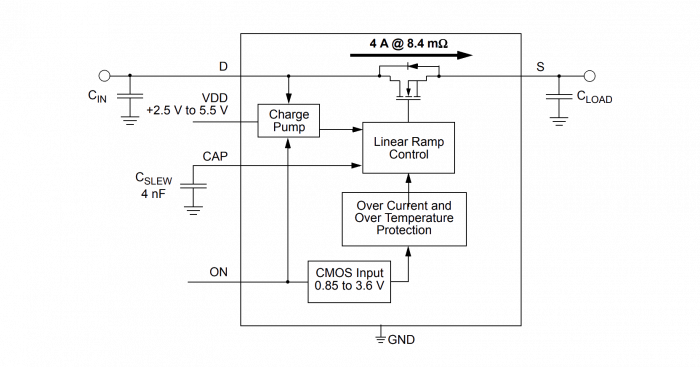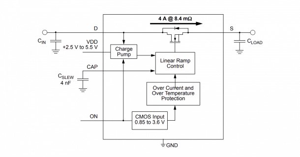 A 125°c额定,3 mm²,8.4 mΩ,4 A内部保护集成电源开关
