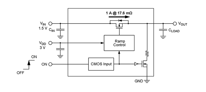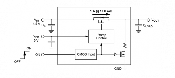 一个超低功耗,17.6毫欧,1个A,0.82平方毫米WLCSP集成电源开关控制浪涌电流的