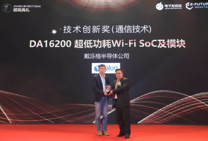 China IoT Innovation Award, an annual award ceremony, funded by the industry magazine Elecfans, was held for the fifth time in Shenzhen on December 4th, 2020. Dialog’s DA16200 ultra low power Wi-Fi SOC and modules won the IOT Technology Innovation Award within the category of best communication technology launched in the last 12 months and the lowest power consumption in the IoT industry.