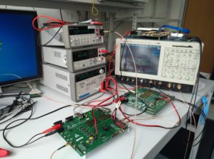 验证系统本身由带有用于芯片的插座的电路板组成。该板包含一个带有大型Xilinx FPGA的子卡,通过以太网连接到实验室的网络。我们可以通过网络轻息地编程FPGA,并使用它来控制所测试(DUT)的设备的所有数字输入,并监控其输出。来自DUT的各种模拟输入和输出连接到可切换,可以将它们切换到一组超级版本A(SMA)连接器,该连接器连接到范围,频谱分析仪和信号源。我们还可以远程控制这些仪器中的每一个,并在一起意味着来自DUT的所有输入,输出,模拟和数字信号都可以强制到我们想要观察的任何值。