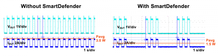 Dialog的SmartDefender™技术检测软短路状态和进入智能打嗝模式(参见下图)。而不是在每个复位周期提供充分的输出功率,SmartDefender递增复位周期之间的时间,以减少平均输出功率。当故障条件消退,它自动地复位到正常运行模式,进行充电提供全功率。SmartDefender™先进打嗝模式可以通过高达75%减少在电缆和连接器中的功率耗散,而无需手动重置适配器 - 不需要附加的外部元件。